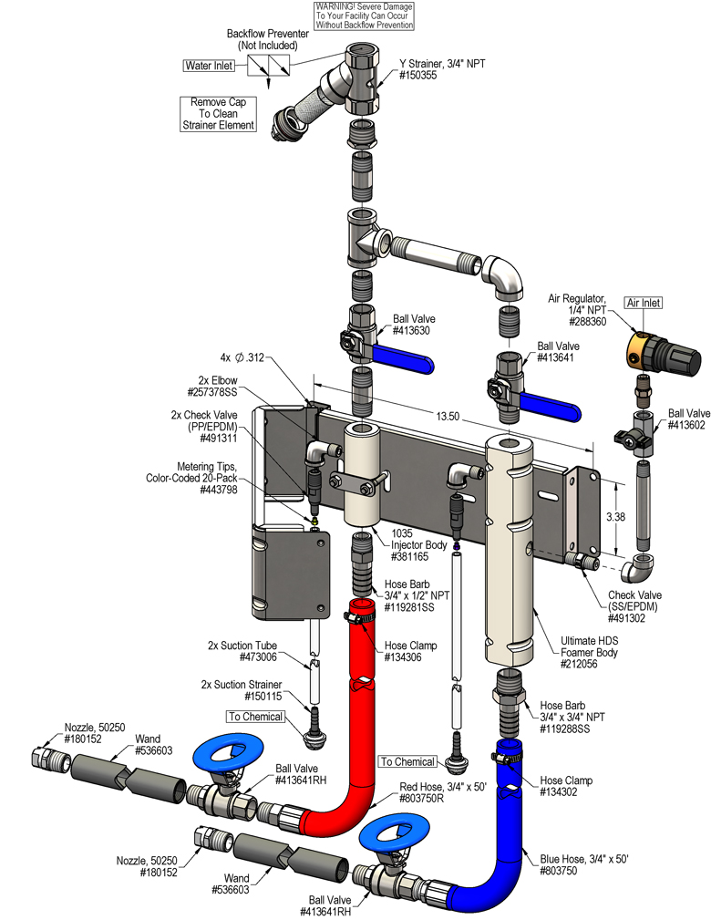 The 2-Hose 1035 Sanitise/Ultimate Foam Hose Drop Station is a combination foam/sanitiser applicator for applying one chemical as foam and another as a high-volume, sanitising spray. Dedicated hoses assure no cross-mixing of foaming and sanitising chemistry. This venturi injection system uses standard city water pressure (35 – 125 PSI) to draw and blend chemical concentrates into the water streams to create accurately diluted solutions using precision metering tips to control chemical usage. Rich, clinging foam is created by injecting compressed air into the foaming solution to greatly increase volume and coverage ability. The foaming solution is then projected through the discharge hose and fan nozzle at distances up to 12 feet. The sanitiser solution is projected as a “flooding” spray for fast, complete coverage.