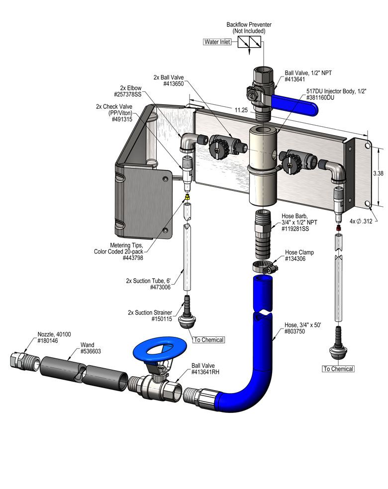 The 2-Way 517 Sanitizer is a high volume spray applicator for projecting 2 sanitizer solutions as a heavy spray on to any surface or equipment. With a high flow rate, this unit dilutes chemical concentrates to the lean ratios required for no-rinse sanitizing in food plants. This venturi injection system uses standard city water pressure (35 – 125 PSI) to draw and blend chemical concentrate into the water stream. Precision metering tips are used to create an accurately diluted solution which is projected through the discharge hose and fan nozzle as a 5.4 GPM heavy spray. Use the chemical ball valves to inject the 2 chemicals separately or simultaneously.