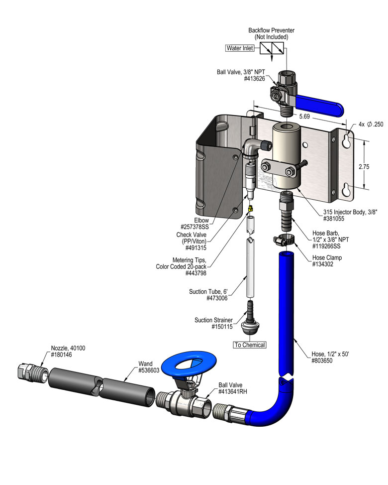 The 315 Sanitizer is a high volume venturi injection system that uses standard city water pressure (35 – 125 PSI) to draw and blend chemical concentrate into the water stream. Precision metering tips are used to create the lean ratios required for no-rinse sanitizing in food plants. The solution is then projected through the discharge hose and fan nozzle as a 4 GPM coarse spray on to any surface or object.