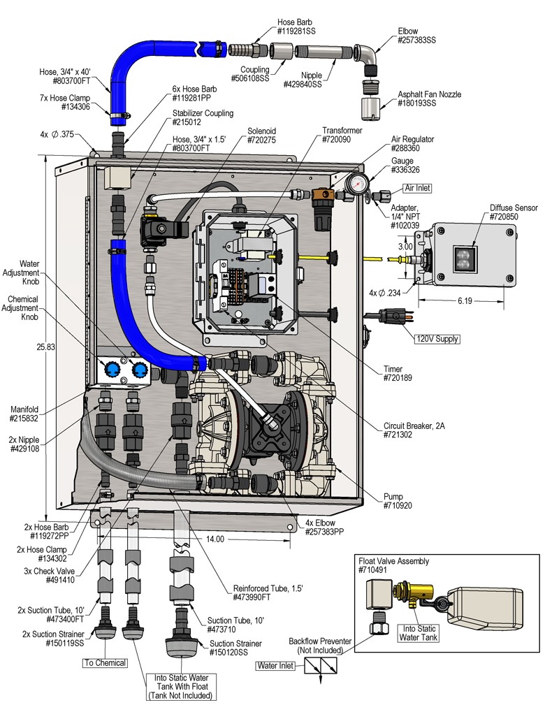 The RADAR™ Single Eye AP-MM Spray System is a photoelectric sensor-activated, time delayed, asphalt release applicator that mounts to a user-supplied drive-though arch for spraying asphalt truck beds. This system uses a rugged Sandpiper air-operated, double-diaphragm pump to draw chemical concentrate and water from separate static tanks and blend them “on-the-fly” to create an accurately diluted solution. When a truck comes into range of the single-eye, diffuse-reflective photoelectric sensor, a delay timer allows the driver to position the truck under the nozzle before spraying begins and a run timer limits application to a pre-set time period or until the vehicle leaves the spraying area, whichever is first.