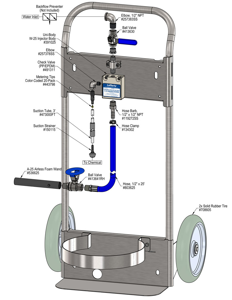 The Portable Uni-Body A-25 Airless Foamer is a medium volume foam applicator featuring an all stainless steel cart assembly. It will project foaming chemicals on to any surface up close or at distances up to 6 feet without compressed air. This venturi injection system uses standard city water pressure (35 – 125 PSI) to draw and blend chemical concentrate into the water stream to create an accurately diluted solution. The solution then flows through the discharge hose to the airless foam wand which draws in atmospheric air to create and project wet, clinging foam.