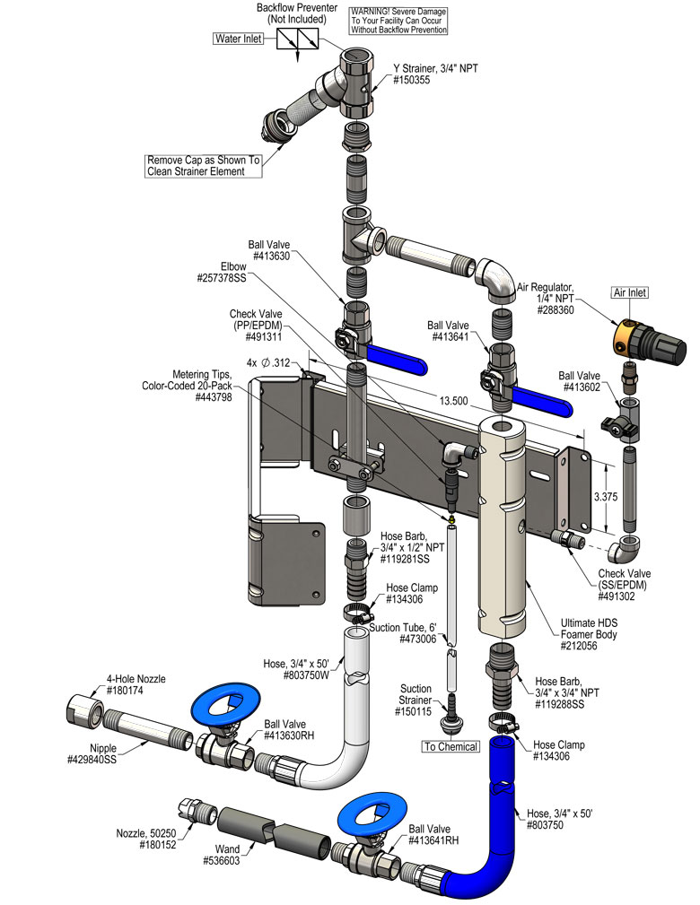 The Rinse/Ultimate Foam Hose Drop Station is a medium volume foam applicator for projecting foaming chemicals on to any surface up close or at a distance and for rinsing. This venturi injection system uses standard city water pressure (35 – 125 PSI) to draw and blend chemical concentrate into the water stream to create an accurately diluted solution. Rich, clinging foam is created by injecting compressed air into the solution to greatly increase volume and coverage ability. The foam is then projected through the discharge hose and fan nozzle at distances up to 12 feet. Rinse at full pressure through a separate hose and a unique and powerful stainless steel 4-hole nozzle.